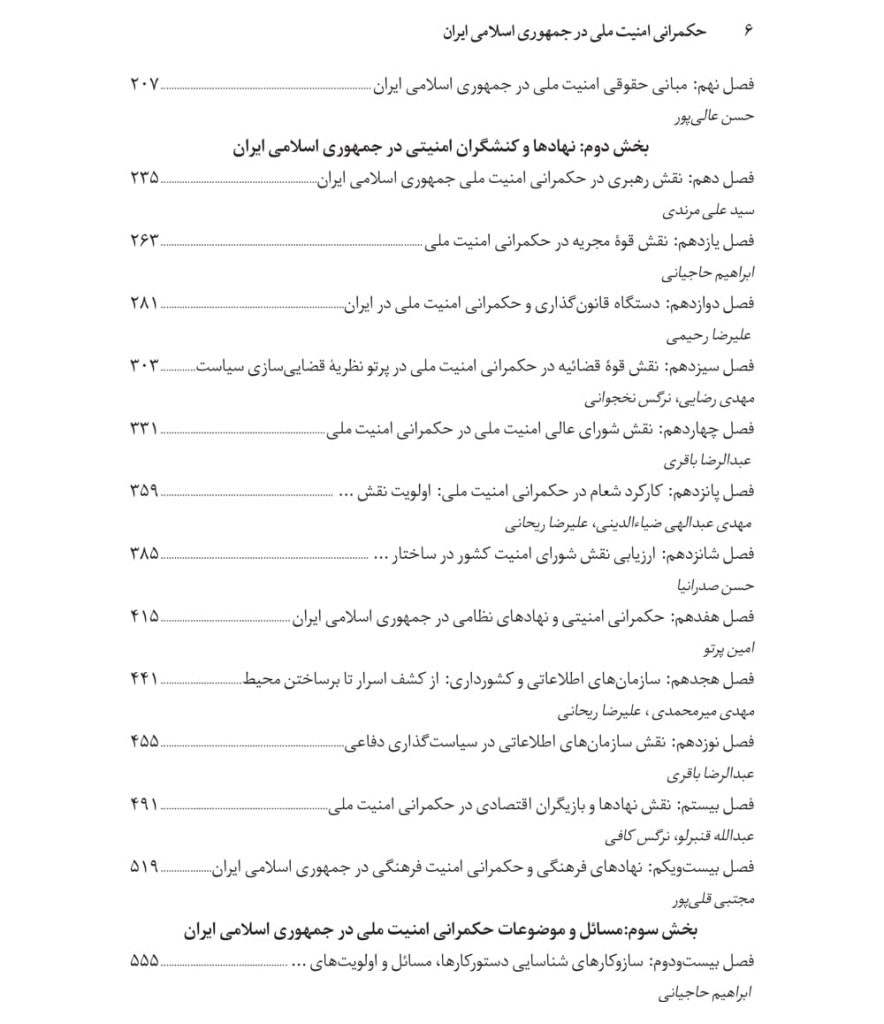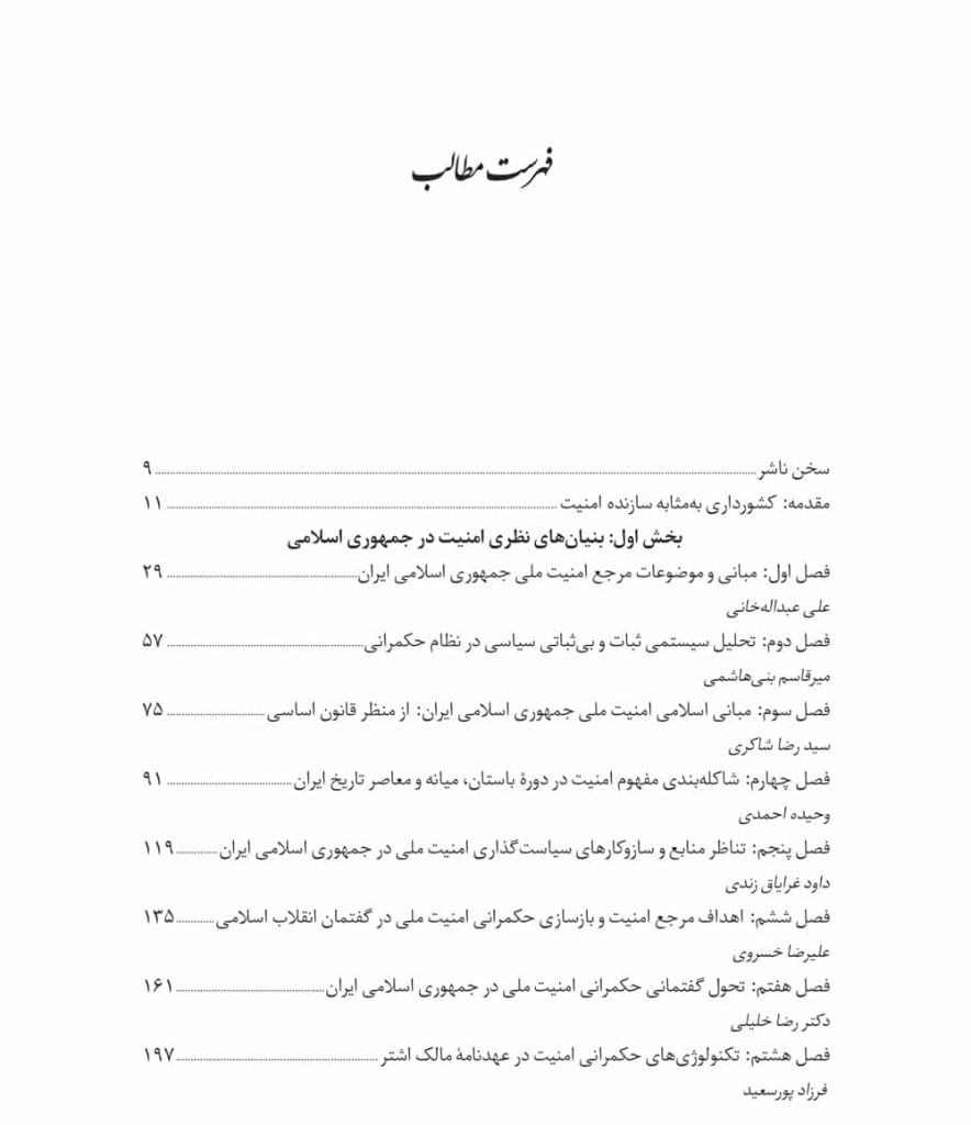 این کتاب بازنمایی ایدۀ «امنیت به مثابه محصول کشورداری» در جمهوری اسلامی ایران است. براساس این ایده، امنیت فلسفۀ وجودی دولت است و دولت از طریق کارکرد کشورداری یا حکمرانی آن را تولید میکند. بدین ترتیب «کشورداری کارآمد» مولد امنیت است و به میزان نقص، کژکارکردی یا ناکارآمدی حکمرانی، کشورها شاهد امنیت ضعیف یا ناامنی خواهند بود. کتاب تلاش کرده است ضمن معرفی ایدۀ فوق، به سه پرسش بنیادین در خصوص حکمرانی امنیت ملی در جمهوری اسلامی ایران پاسخ دهد. مقالات بخش اول به چیستی امنیت در نگاه ایرانی پرداختهاند. بخش دوم کنشگران یا بازیگران مؤثر در فرایند حکمرانی امنیت ملی در جمهوری اسلامی ایران را بررسی کرده است و مقالات بخش سوم نیز مسائل و موضوعات حکمرانی امنیت ملی در جمهوری اسلامی ایران را بازنمایی کردهاند.