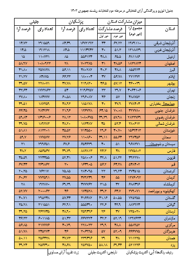 در رویکرد سیاسی، پراکنش آرا بر مبنای نقش مولفه هایی مانند میزان تاثیرگذاری جناحها، احزاب و نقش شخصیتهای سیاسی و نیز تاثیر الگوی رقابت انتخاباتی بر رفتار و گرایش انتخاباتی شهروندان تحلیل میگردد. در رویکرد جغرافیایی، تاثیر همجواری سرزمینی، نقش ویژگیهای محیطی و ژئوپلتییکی، موقعیت مرزی یا مرکزی بر رفتار انتخاباتی شهروندان مورد توجه است و در رویکرد جامعه شناختی، نقش متغیرهایی مانند قومیت و مذهب و ویژگی های هویتی بر رفتار انتخاباتی تحلیل میگردد. در رهیافت اقتصاد سیاسی، تاثیر عواملی مانند شاخصهای رفاهی، الگوی توسعه ملی، و نابرابریهای اقتصادی در مناطق بررسی میشود. در این یادداشت کوتاه با توجه به این رهیافتهای تحلیلی، به اختصار به نکاتی در تحلیل الگوی پراکنش آرای انتخاباتی استانها و مناطق کشور پرداخته میشود؛ قبل از ورود به تحلیل در جدول زیر میزان مشارکت استانها در دور اول و دوم و نیز توزیع و پراکندگی آرای انتخاباتی دو کاندیدا در مرحله دوم انتخابات ریاست جمهوری ارائه میشود. در این جدول ردیفهای به رنگ آبی بیانگر رای اکثریت مردم استان به مسعود پزشکیان، ردیفهای به رنگ نارنجی نشانگر رای اکثریت مردم استان به سعید جلیلی و ردیفهای رنگ زرد نشانگر رای تقریباً بینابین دو کاندیدا در این استانها میباشد.
